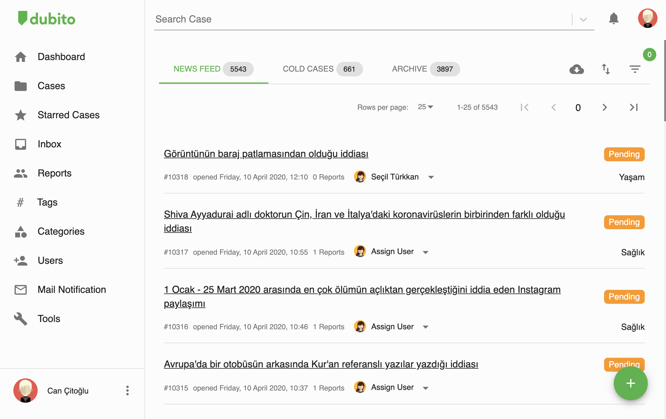 Dubito is a fact-checking helper tool. It automatically collects user reports from Messenger, Twitter Direct Message, Twitter Mentions so that Engagement Editor can assign them to cases. Archieves links that are attached to cases in case of change or removal. Shows URL's engagement info on Facebook for prioritization. Dubito also has a chrome extension to see URLs' virality rate on Facebook.