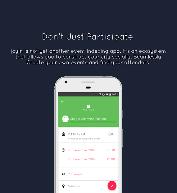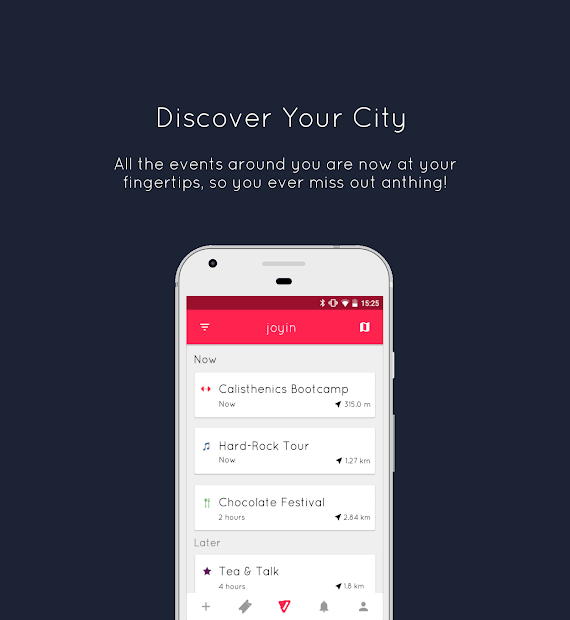 Meeting new people, socializing easily, hearing about nearby events before anyone else does, and never getting stuck on 'what should I do today?' are some of many privileges joyin users benefit from. You can discover nearby events or create your own events and find your attenders, easy as a breeze. Going somewhere and checking your phone is no more! Check your phone and go somewhere, with joyin!