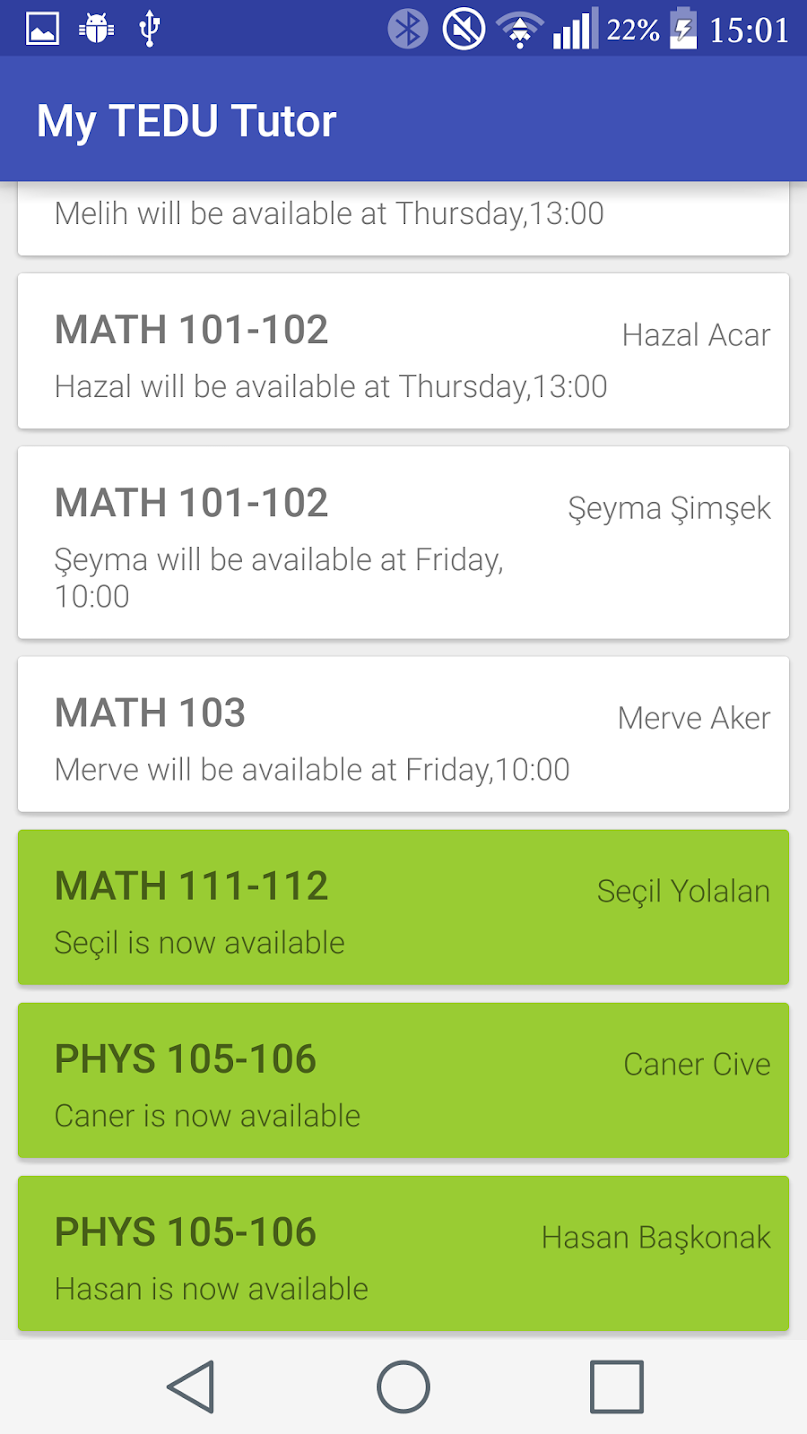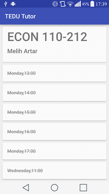 TED University has a peer tutoring system for their students. This app is designed for students so that they can see when the tutor of a desired course is available. Users can see the weekly schedule and next available hour of TEDU Tutors